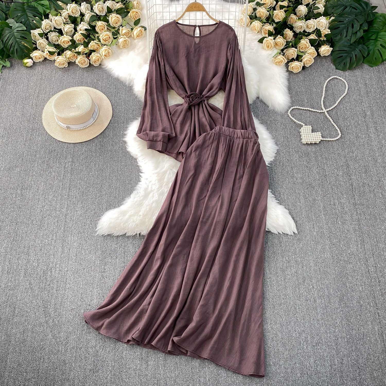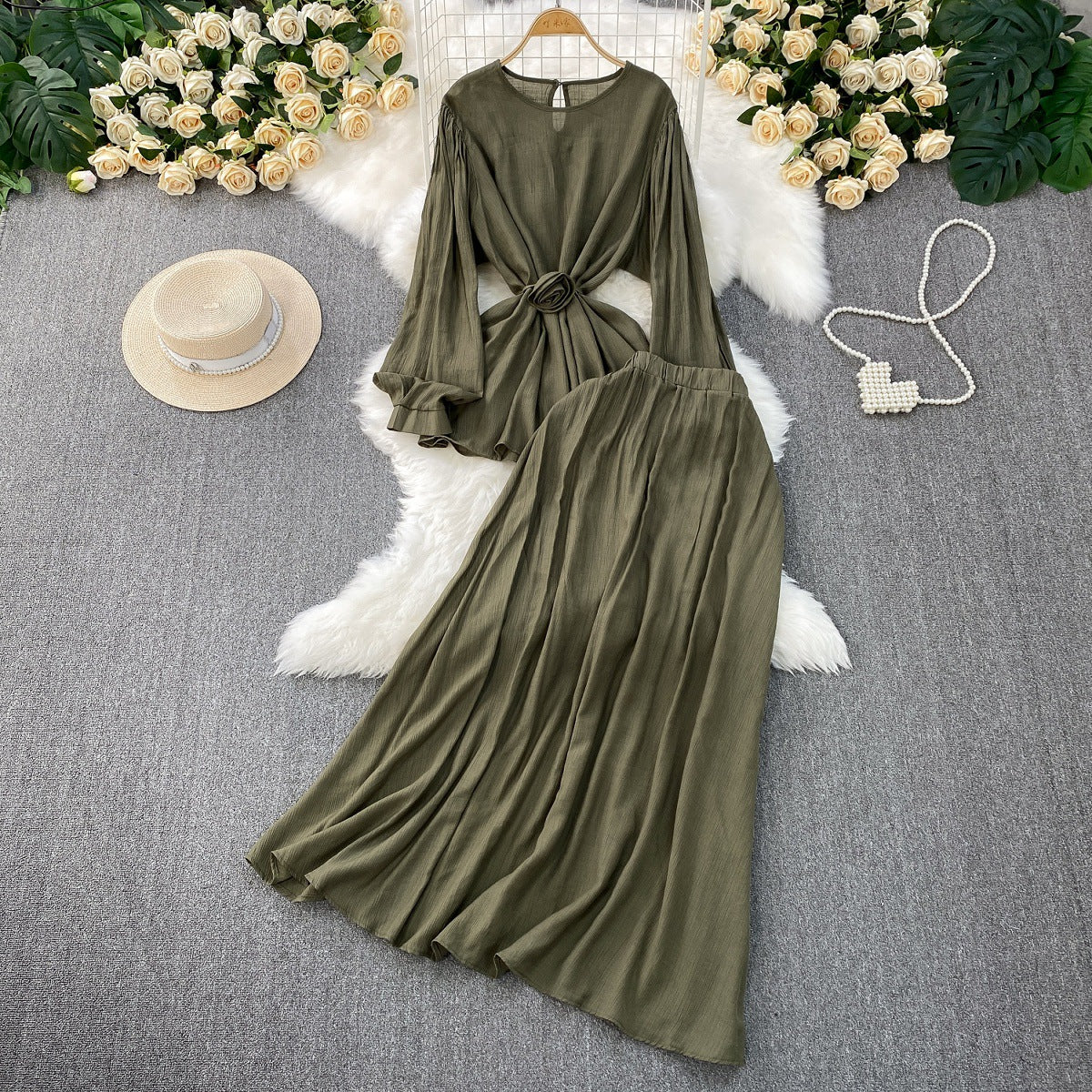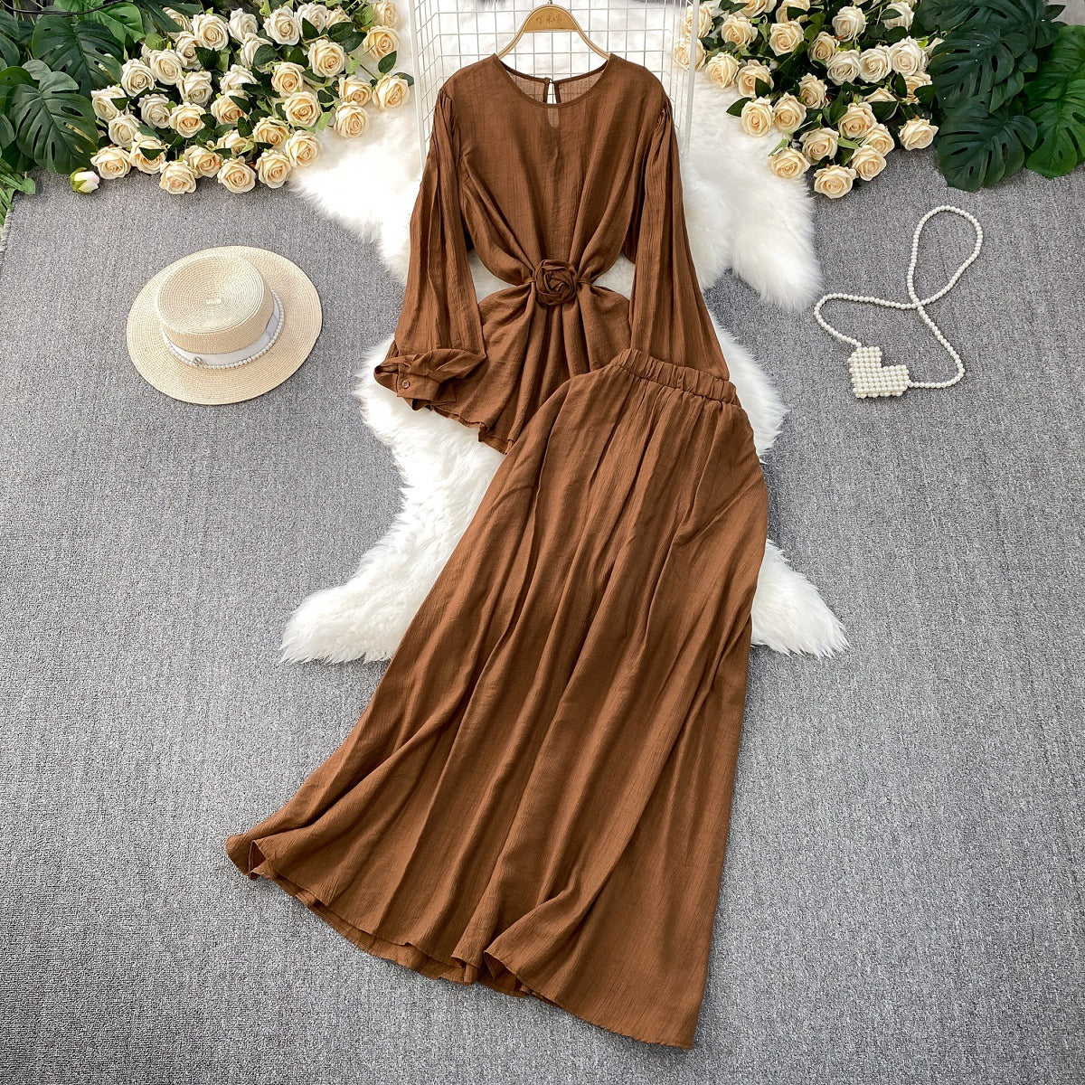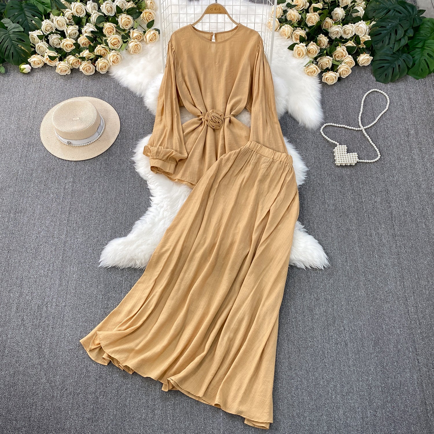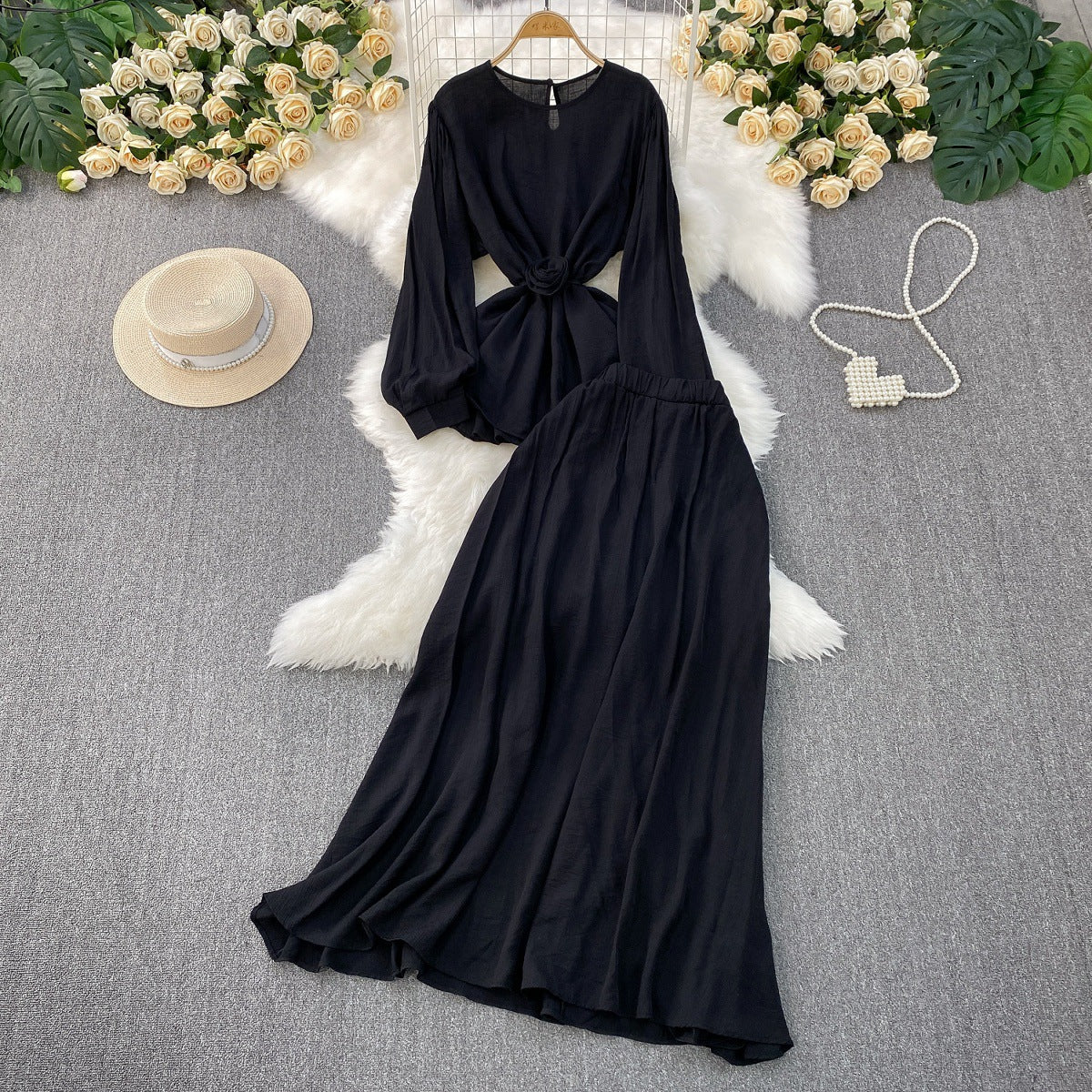 French Style Women's Temperament Twinset Design Sense Lace-up Waist-controlled Fashionable Long Sleeve