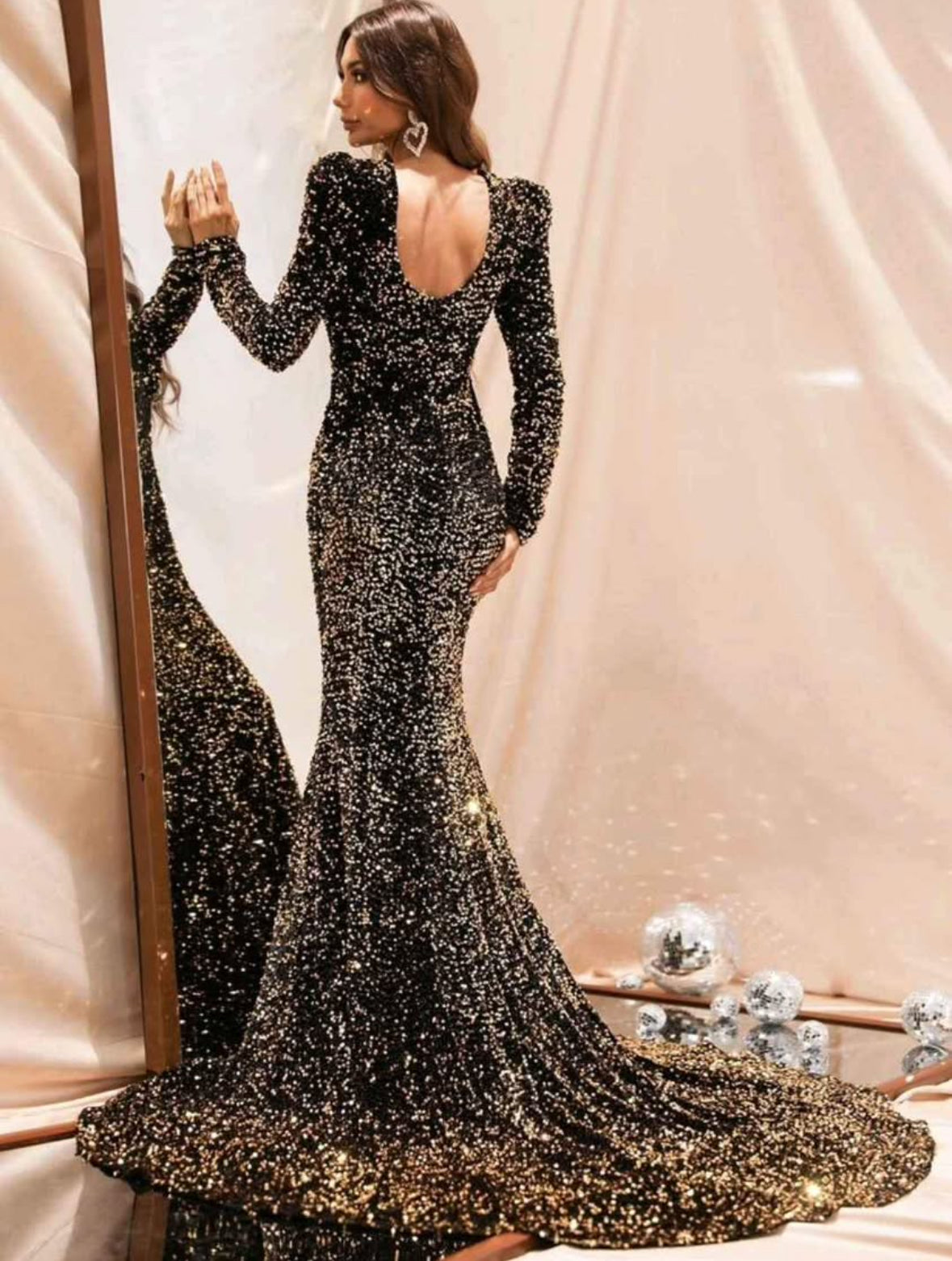 Crafted from 100% polyester sequins, this dress is fully lined and has a medium stretch fabric that allows for ease of movement. It is available in XS, S, M, L, XL, and 1XL sizes, making it a versatile choice for a range of body types. The dress is available in a plain pattern and has a backless and zipper details.