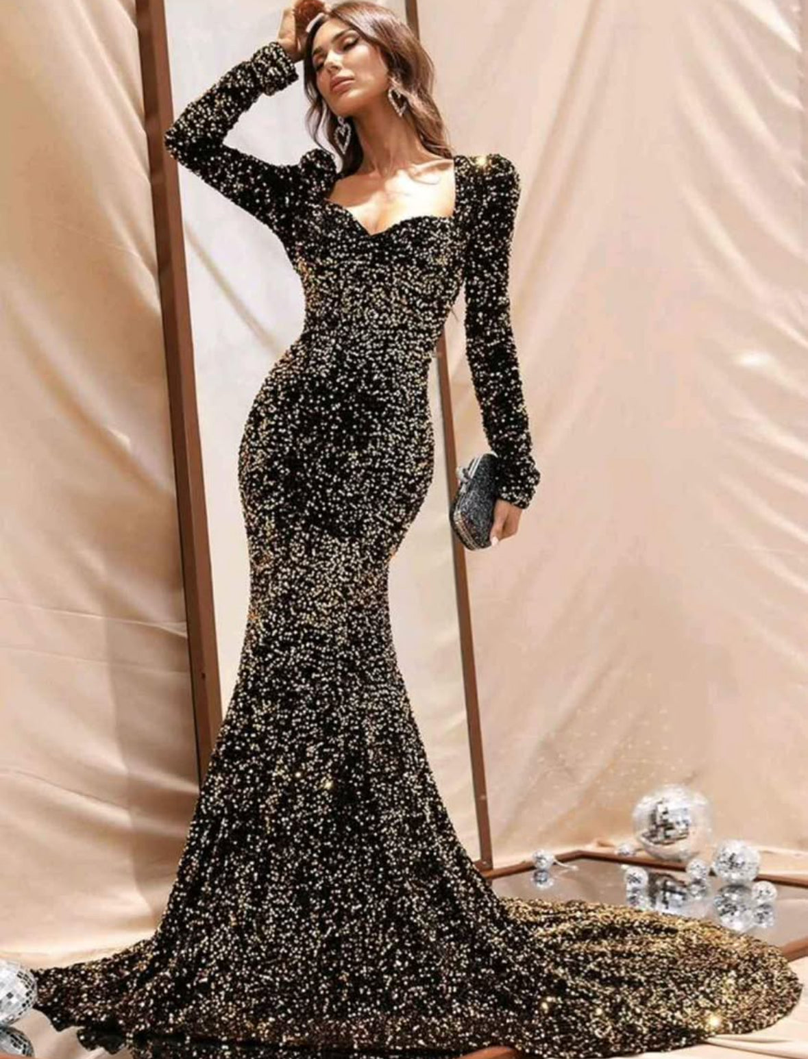 Introducing the Sweetheart Neck Gigot Sleeve Sequin Formal Dress, a stunning piece that is sure to make you stand out at any event. This dress is designed to hug your curves in all the right places, thanks to its bodycon fit and slim fit design. The high waistline and mermaid hem create a dramatic, glamorous silhouette that is both elegant and modern.