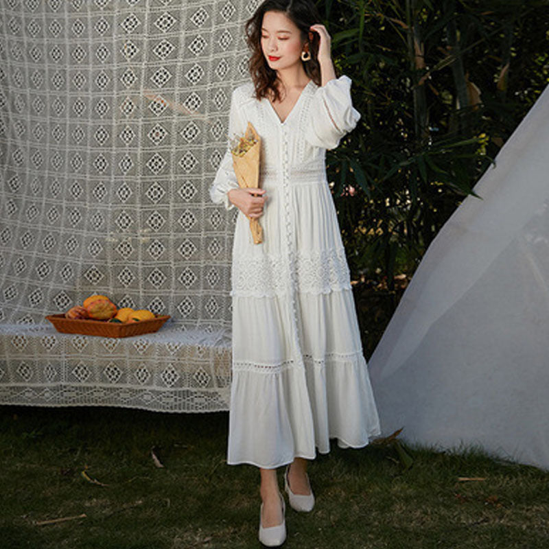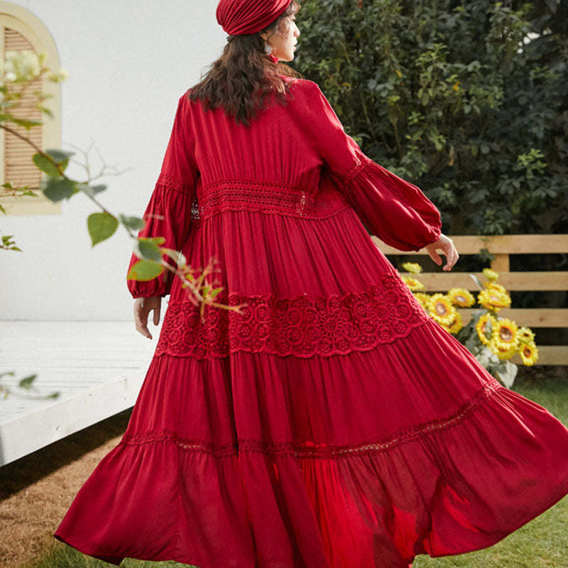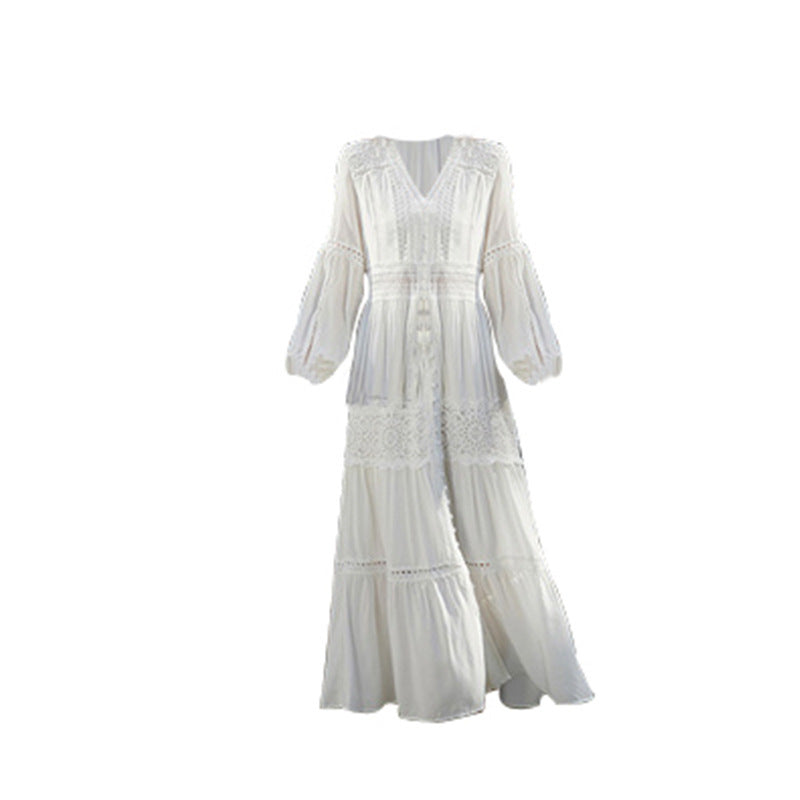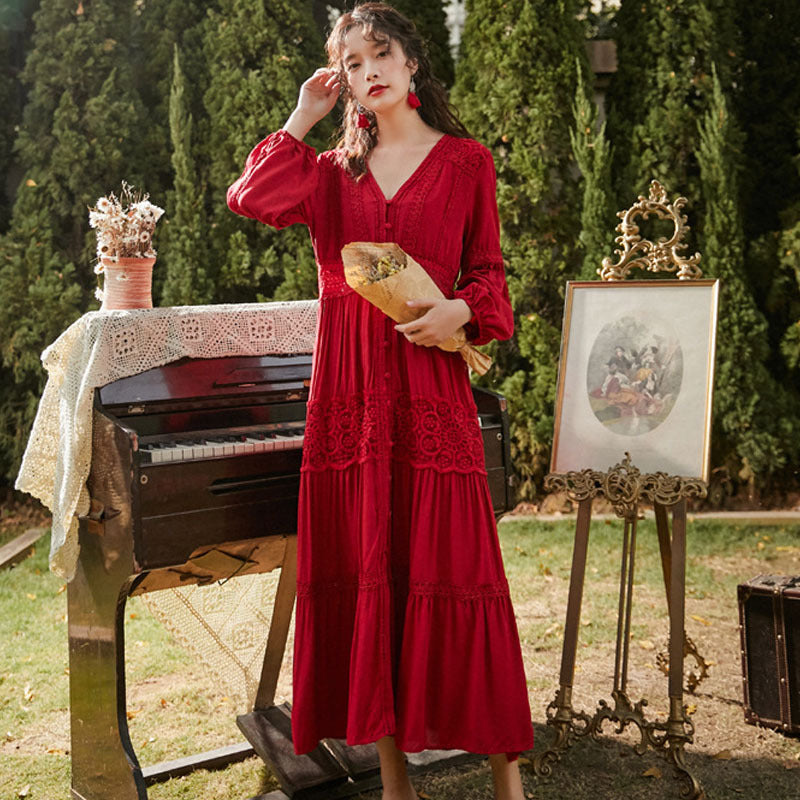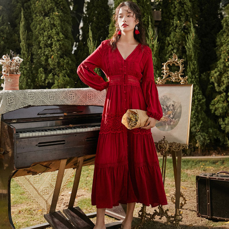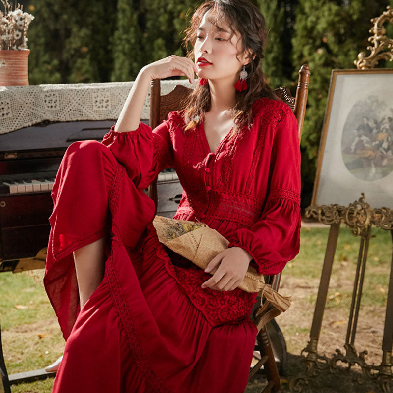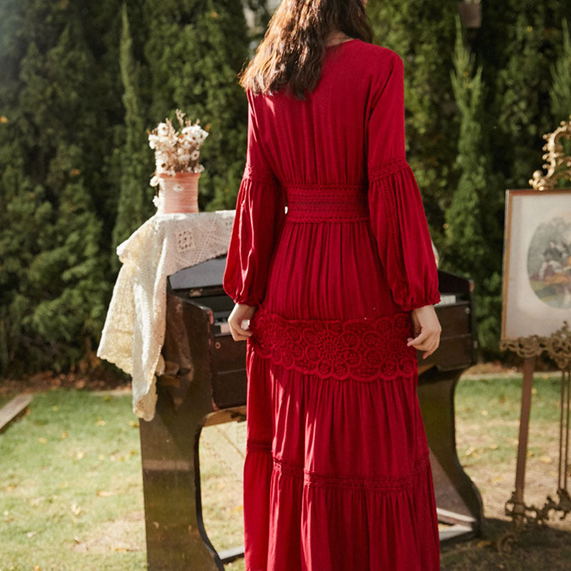 V-Neck High-Waisted Long-Sleeved Lace Dress