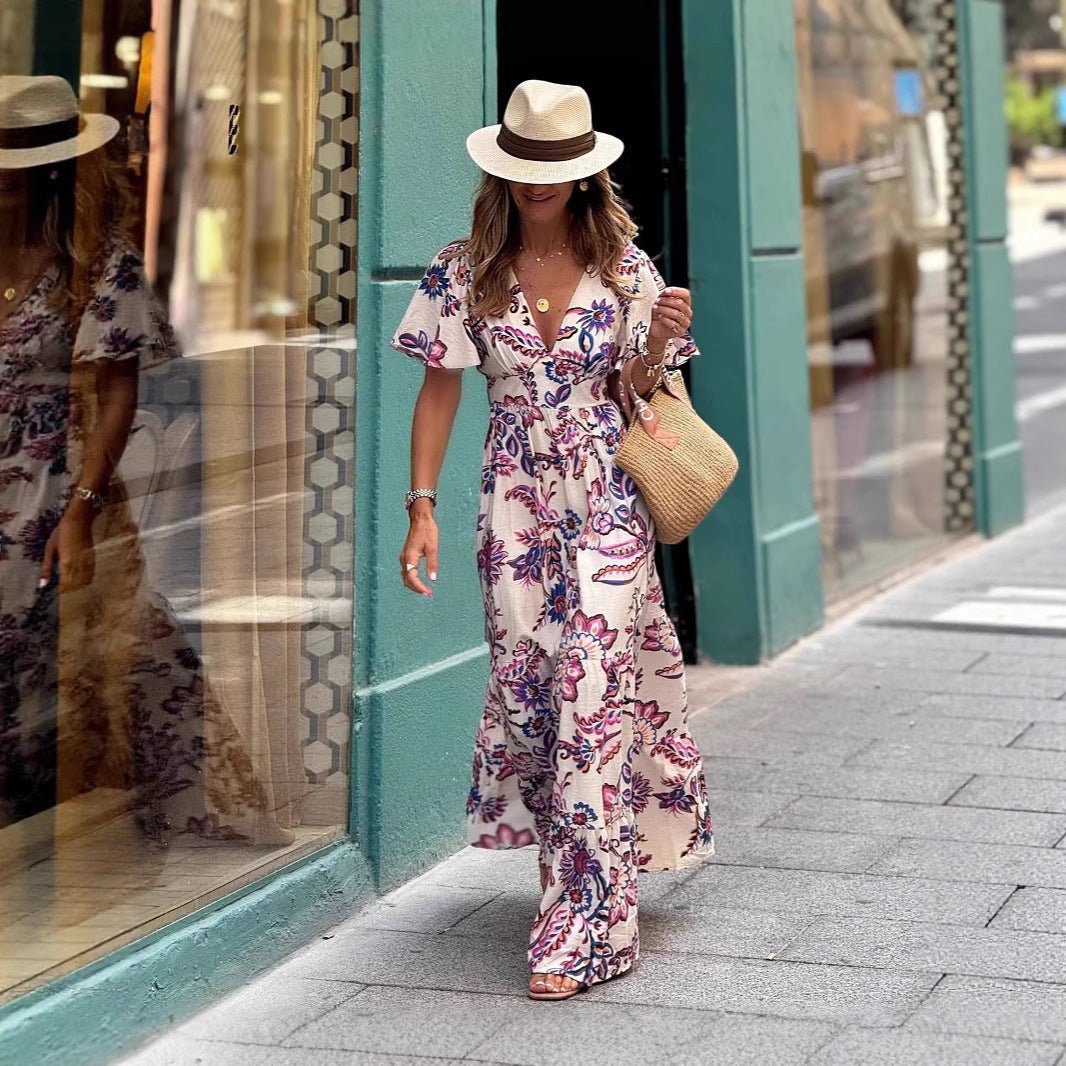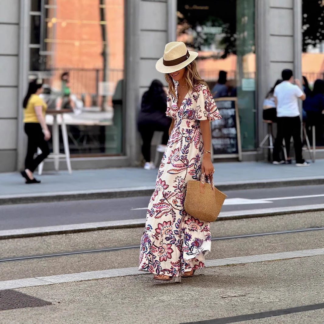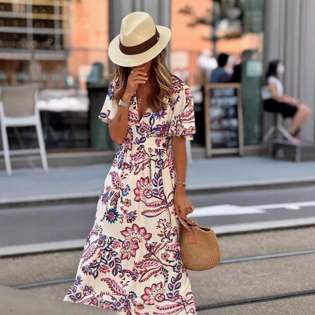 V-neck Waist Trimming Printing Ruffled Short Sleeves Dress